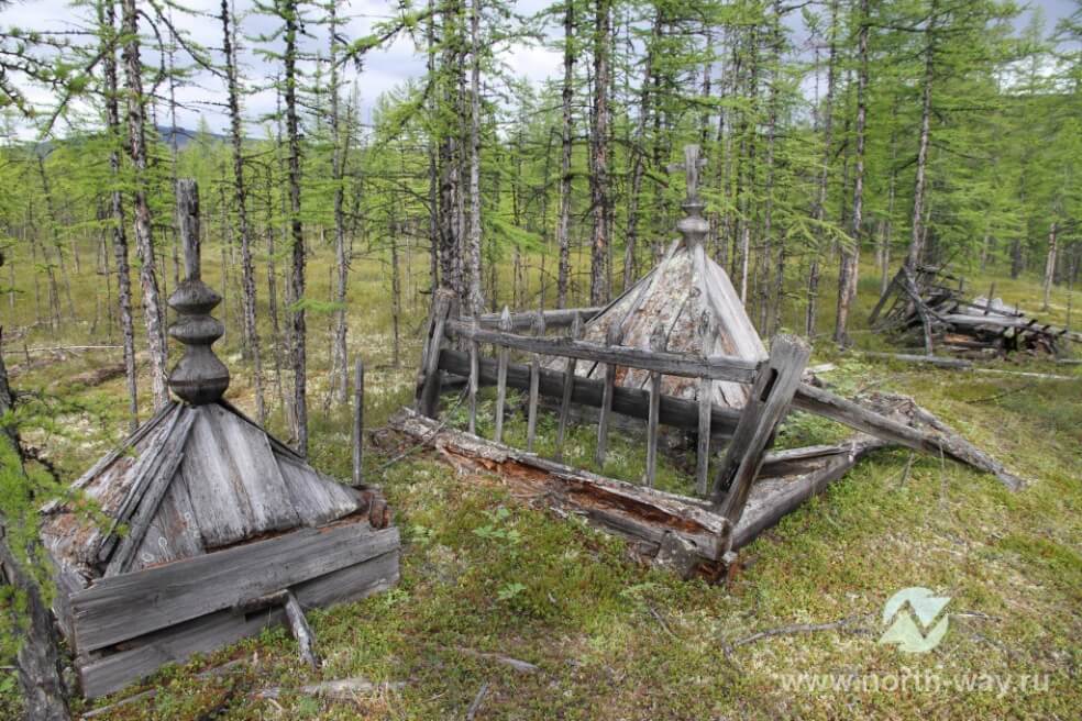 Свободное время я тратил и на изучение местности, лазил по тайге, нашёл старую базу какой-то экспедиции, судя по надписям на консервных банках, годов семидесятых. Полуразвалившиеся каркасы от палаток, запчасти от вездеходов, кучи батареек и щелочных аккумуляторов. Единственное капитальное строение – большая баня на берегу небольшой речушки. Поехал в конец озера, где вытекает из него река Курейка, по правому берегу которой за бугром, судя по ландшафту, должно быть озеро или болото. Забрался на бугор и – точно, небольшое озерко с плавающей по нему гагарой. Обходя его, наткнулся на очень старую могилу, по всей видимости, шамана. Из земли торчали деревянные, покрытые мхом идолы, пробитый ножом бронзовый то ли ковшик, то ли поварёшка. Отверстие в нём соответствовало форме ножа, которые используют уже сотни лет наши коренные жители эвенки. Длинное тонкое лезвие, заточенное односторонне, с правой стороны; прокол от такого ножа напоминает неравносторонний треугольник. Такая форма объясняется многофункциональностью этого оружия. На стоянке он был столярным инструментом, сверлом, долотом, рубанком, а на охоте – орудием добычи и разделки. Как известно, проникающее ранение тонким колющим оружием куда опасней большой раны: повреждаются внутренние органы, входное отверстие затягивается, не давая выходить крови, и животное рано или поздно умирает от внутреннего кровоизлияния, а может, и человек – кто их знает, как они тогда жили. Рядом лежала перевернутая кверху дном полусгнившая деревянная лодочка. Положив пару сигареток на могилу и попросив удачи у духов, я продолжил обход озера. Перейдя через ручей, увидел старый, срубленный когда-то острым топором пенёк и старую, уже заросшую мхом тропинку, ведущую на едва поросший лесом холм. Поднявшись по ней, увидел ещё одно кладбище, но уже с большим количеством могил. Точно почитать было невозможно, большинство их было разрушено временем до такой степени, что определить, что это, было невозможно. Но три сохранились достаточно хорошо. Резные кресты, оградки, сделанные без единого гвоздя… Один памятник был собран на деревянные колышки вместо металлических гвоздей, как и на первой могилке, возле каждой лежала всевозможная посуда с характерными дырками. Возможно, оставляли что-то ещё, но оно просто не долежало до моего прихода, превратилось в труху. Один памятник выделялся из всех, он был обшит тонким листовым железом, которое крепилось к деревянной основе маленькими коваными гвоздиками. Видимо, это было самое последнее захоронение на этом погосте. Была начеканена какая-то надпись, но прочесть её я не смог, сильно уж металл был съеден ржавчиной. Неподалёку штабелем лежали когда-то срубленные топором уже загнившие деревья, причём большого диаметра. Я не видал, сколько ни лазил по здешней тайге, ни одного хоть немного похожего дерева. Откуда их привезли? Ещё одна интересная находка: уже осыпавшиеся, готовые для захоронения ямы. Неужели могилы копали впрок, летом? Опять же, как узнавали нужное количество? Я понимаю, что возможно предположить смерть пожилого, больного человека, но ведь умирают не только от старости. Одни загадки.