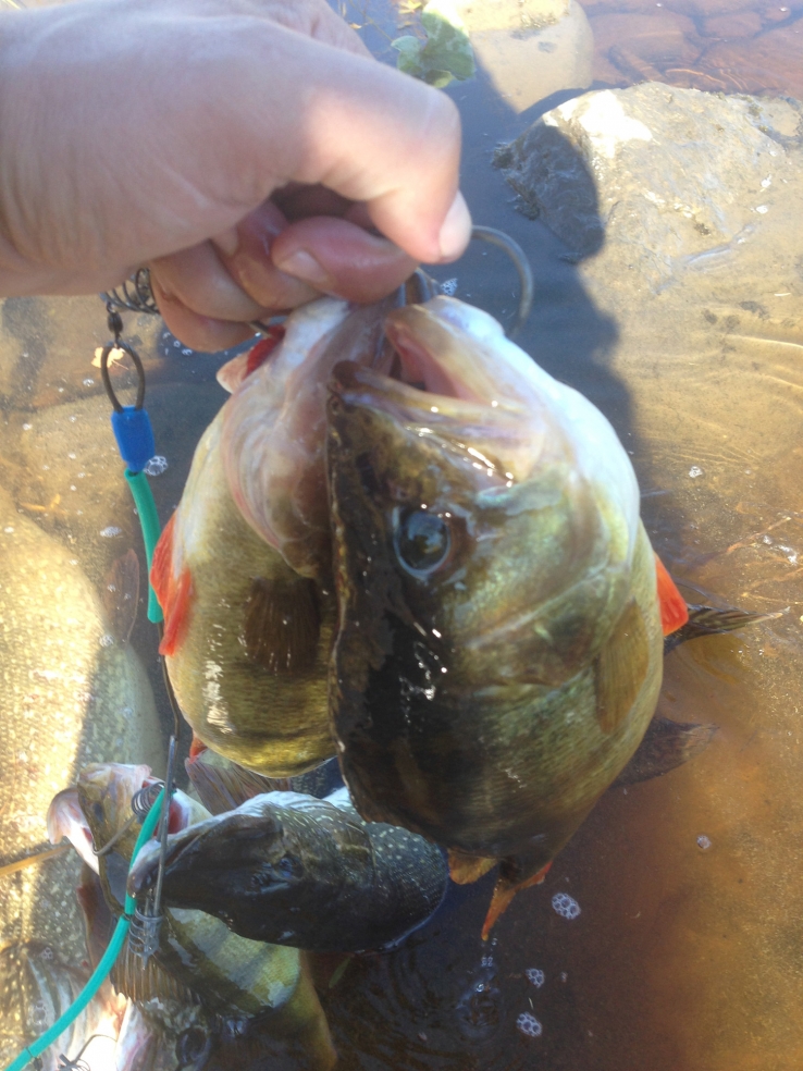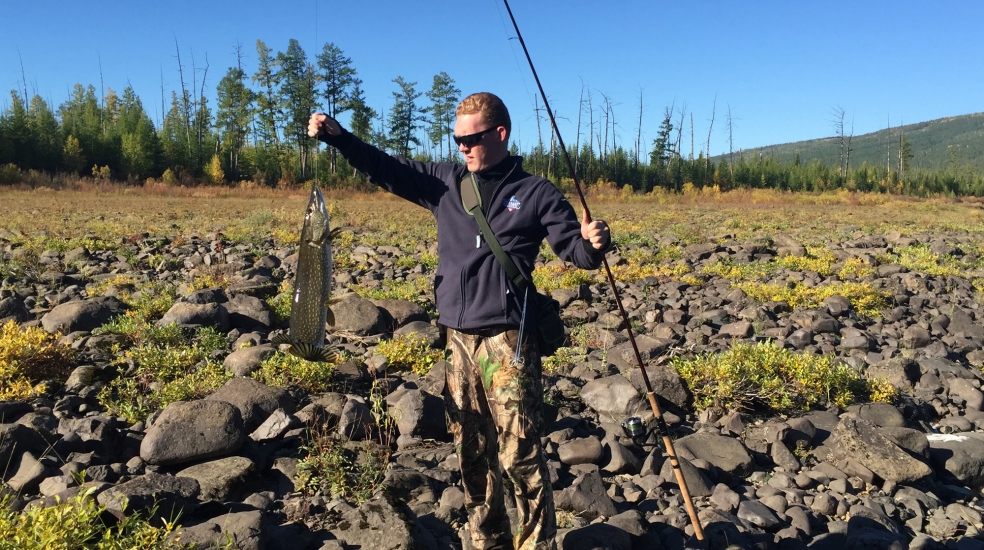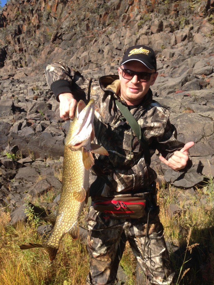 Часа через полтора, по приземлении, пока гидами строился лагерь, народ похватался за палки, и ну стегать воду. Начали с пары килошных окуней. Потом пошли щучки по 3-4 кг, - как потом выяснилось – здешний стандарт. Первые обрывы дали понять – по снастям лучше не халявить.