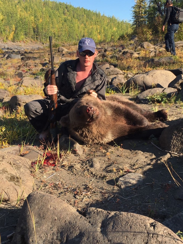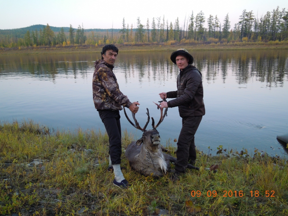 Касательно дичи: утка годится не всякая – надо выбирать; гуси косяком пролетели мимо, презрительно молча. Но зато, пока учились ловить тайменя, - на противоположный берег вышел косолапый. У Лехи тут же вся кровь в организме заменилась на адреналин. Результат – на фото. Да в другой раз Олег на притоке «подсек» оленя – пришлось до лагеря его транспортировать самосплавом. Когда жарили на сковородке, оленина вдруг запахла грибами, - говорят, потому что в тайге год был грибной, олень сам нафаршировался.