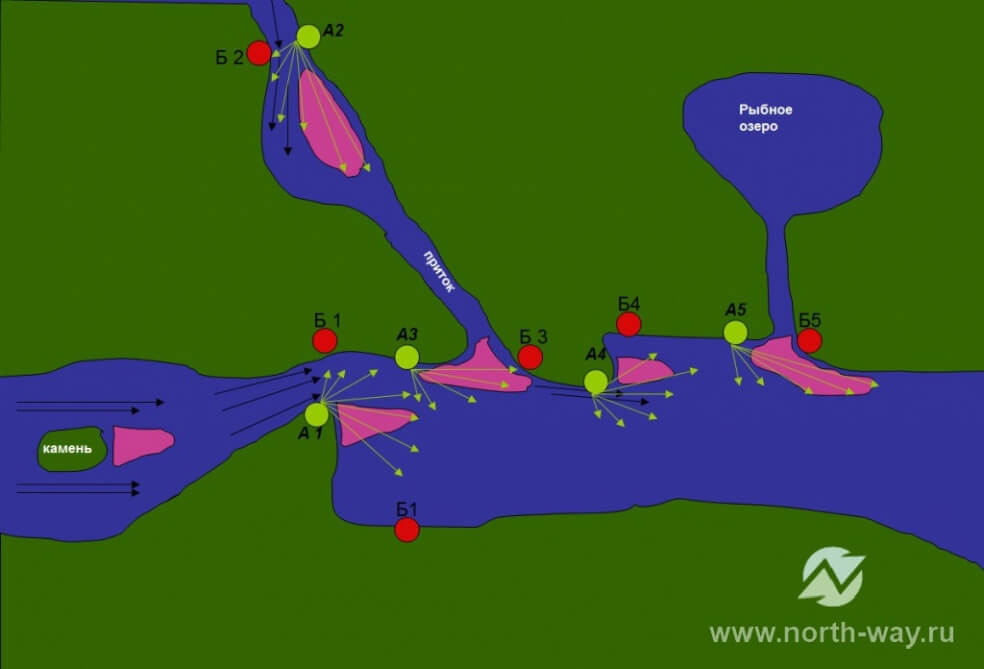 Поскольку течение быстрое, перспективных мест для ловли немного, на схеме они обозначены точками А. С них мы беспрепятственно доставляем приманку в нужные нам места акватории, при этом течение нам не мешает, а даже помогает. Приманка, описывая дугу, движется к месту вероятной стоянки хищника, то есть к границе быстрой и стоячей воды.