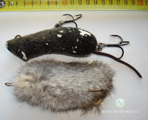 Часто «мышей» обклеивают натуральным мехом. Такие приманки, конечно, уловисты, но, увы, очень часто требуют ремонта. Кроме того, натуральный мех со временем преет и разлагается, причем от этого страдают также крючки и стержень в корпусе.