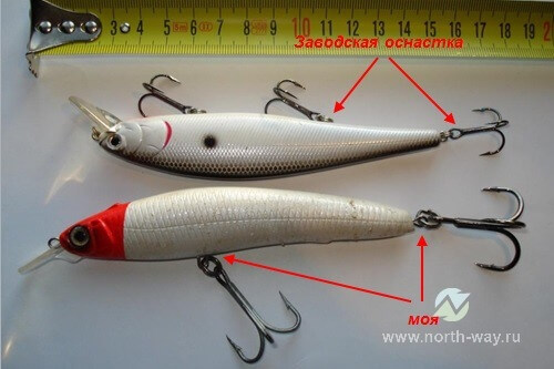 Воблеры желательно плавающие, дающие возможность обойти при необходимости препятствие на дне. Заглубление – не более 50 см (напомню, реки у нас в Эвенкии мелкие). Наиболее уловистая расцветка – красно-белая. Обязательно стоит заменить заводные кольца и крючки.