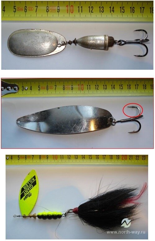 Хорошо работают «вертушки», например, «классика» от MEPPS и BLUE FOX, в основном№6. Наиболее ходовые расцветки – серебро, медь, латунь. Из «колебалок» отмечу EPPINGER Dardevlet, WILLIAMSWabler, MEPPS Syclops и им подобные.